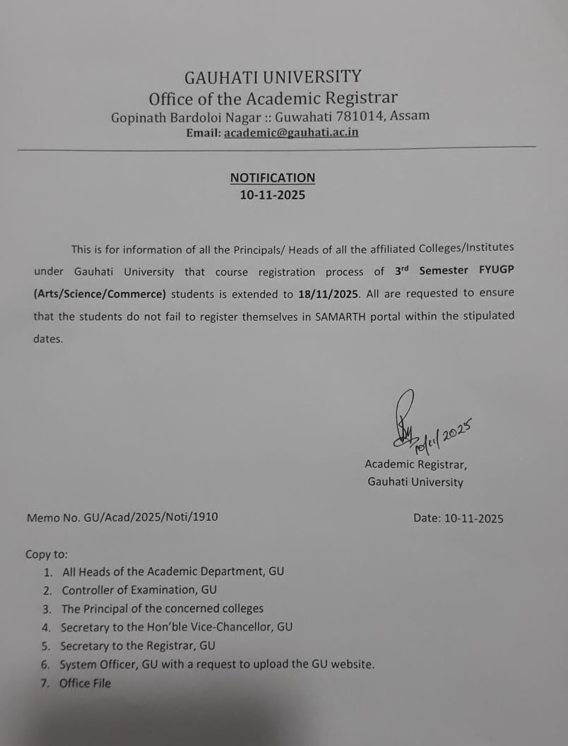 2025-11-10-FYUGP 3rd Semester (ARTS / SCIENCE / COMMERCE) Course registration date extended to 18th November, 2025-Click Here