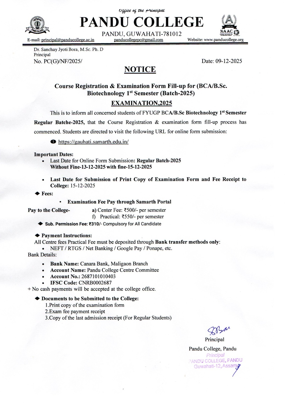 2025-12-09-BCA /Biotechnology 1st Sem (Regular Batch-2025) Course Registration & Exam Form Fill-up Notice -Click Here